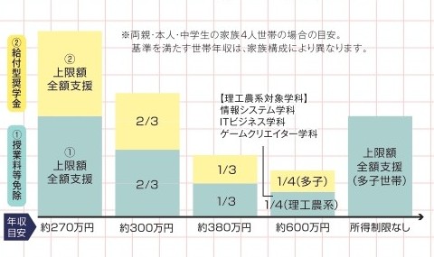この制度により、世帯収入や学業成績などの要件を満たしていれば、授業料、入学金の減免及び給付型奨学金(返還不要)を受けることができるようになります。