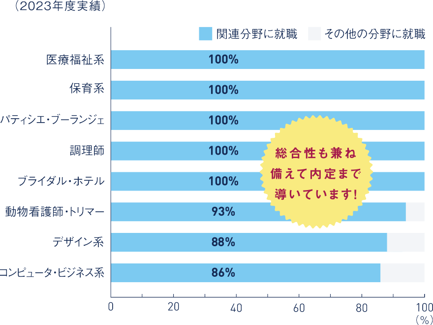 専門学校は、進学した学科・コース分野への業界就職率が高い点が特長です。もちろん、他分野での就職も可能です。その場合でも、学んだことを活かして活躍できます。