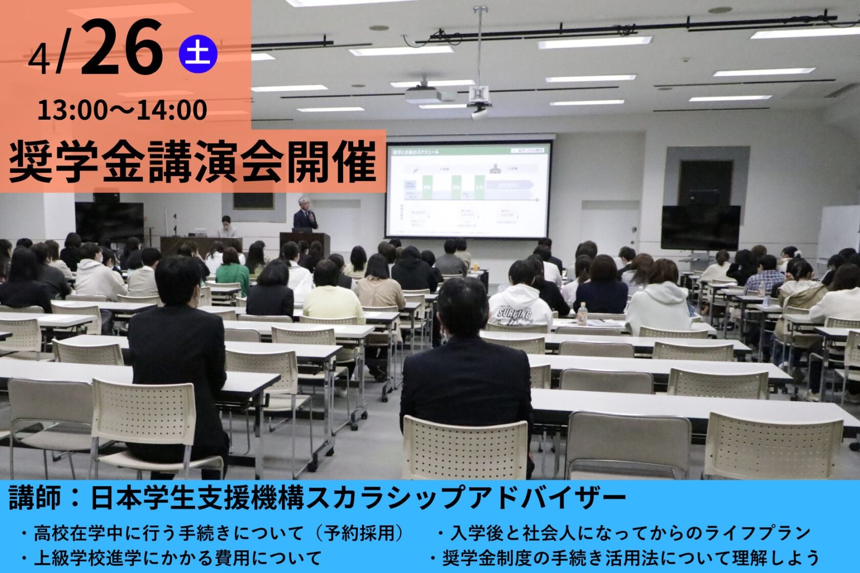 ※午前中(10:00~)はオープンキャンパスを開催していますので、ぜひ合わせてご参加ください。オープンキャンパスと奨学金講演会の両方に参加される方は、イベントごとにご予約が必要です。オープンキャンパスに申し込む