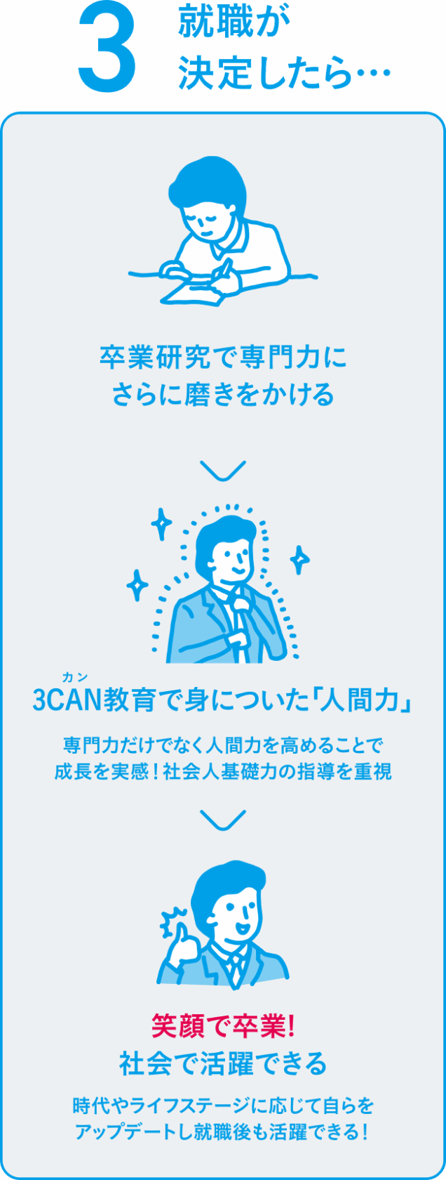 基礎学力・専門知識に加え、人間力を高めることで成長を実感し、時代やライフステージに応じて自らをアップデートすることで就職後の活躍にも繋がります。
