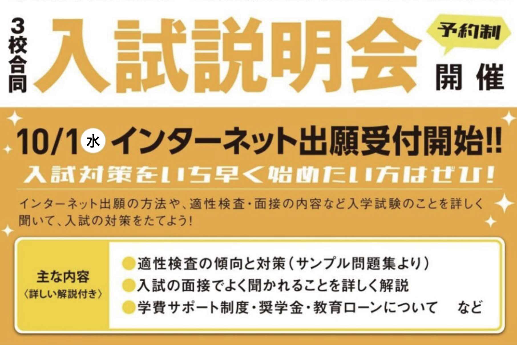 さらに8月30日・9月20日には「入試説明会」も開催します。出願開始前最後の開催ですので出願予定の人は必ず参加して準備をしておきましょう!