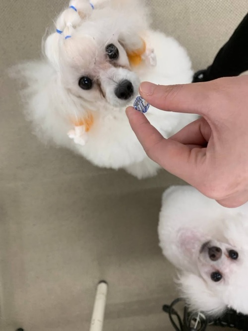 ▽おまけ。手作りリボン用のビーズをおやつと勘違いしてキラキラの眼差しでみてくるスタッフ犬たち