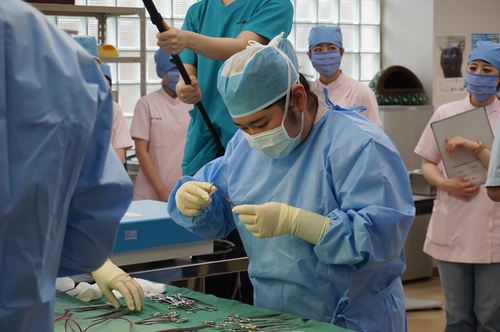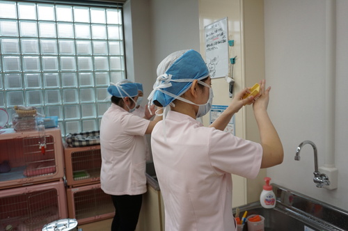 ▽全員が真剣に自分の役割をこなしていきます。 手術中も先生や先輩動物看護師さんから随時指導が入ります。