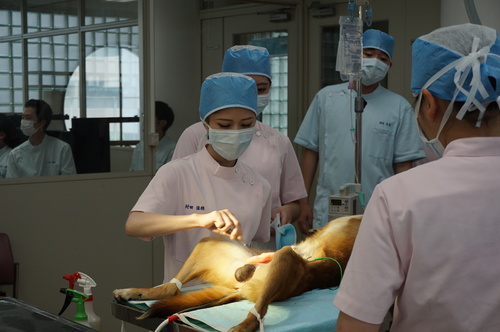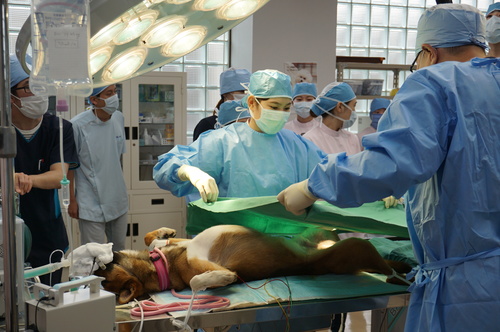 執刀はあべ動物病院院長の阿部晋二先生、サポートは当校の教員でもある中川先生です。