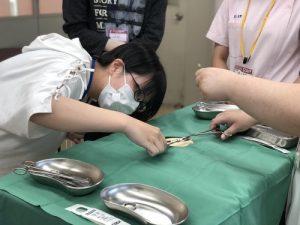 ▽手術補助体験。縫合する獣医の先生の手早さに「すごい!」の声も。
