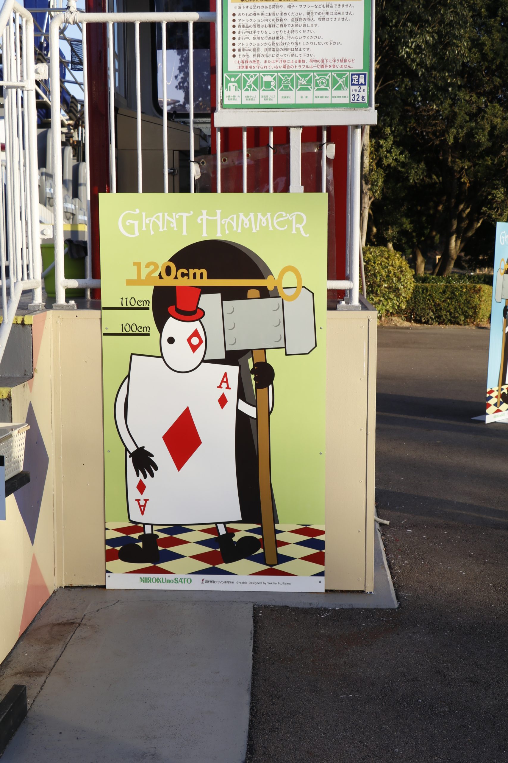 この看板はみろくの里の遊園地アトラクション乗り場「ジャイアントハンマー」の前に設置してあります。