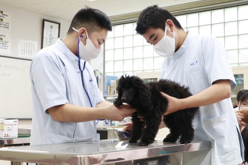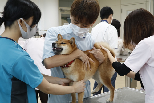 今日は、獣医師の田上先生先生立会いの下、学生達はスタッフ犬たちのバイタルチェックや接種時の保定、カルテ記入など一連の流れを実施しました。