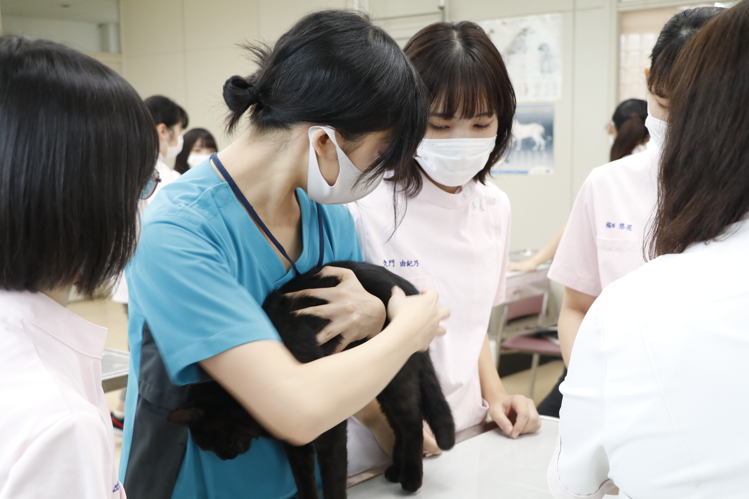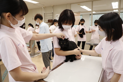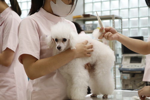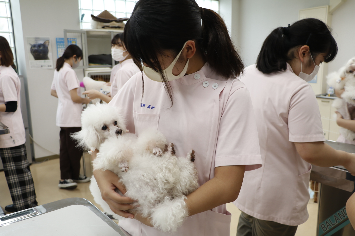 穴吹動物専門学校の動物看護総合学科では、モデル犬に協力してもらいながら、実際に動物病院で使用する器具を使用して授業を行い、動物看護師として即戦力で活躍できる技術を身に付けています。