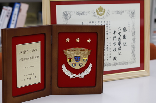 これは、本校が永年にわたり防衛思想の普及および防衛基盤の育成に尽力していること、特に自衛官の募集活動に寄与し、中部方面隊の充実発展に貢献したとして贈られたものです。