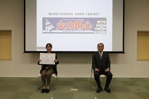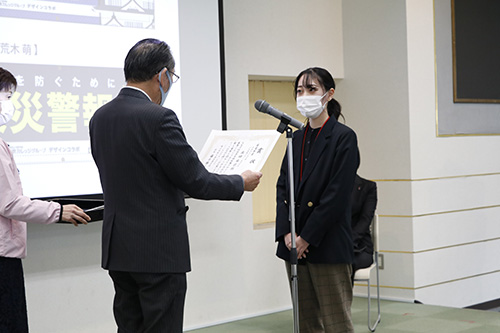 CGデザイン学科1年の荒木萌さんと奥田麻衣さんがそれぞれデザインした防火啓発の横断幕がこの度完成し、表彰式が行われました。