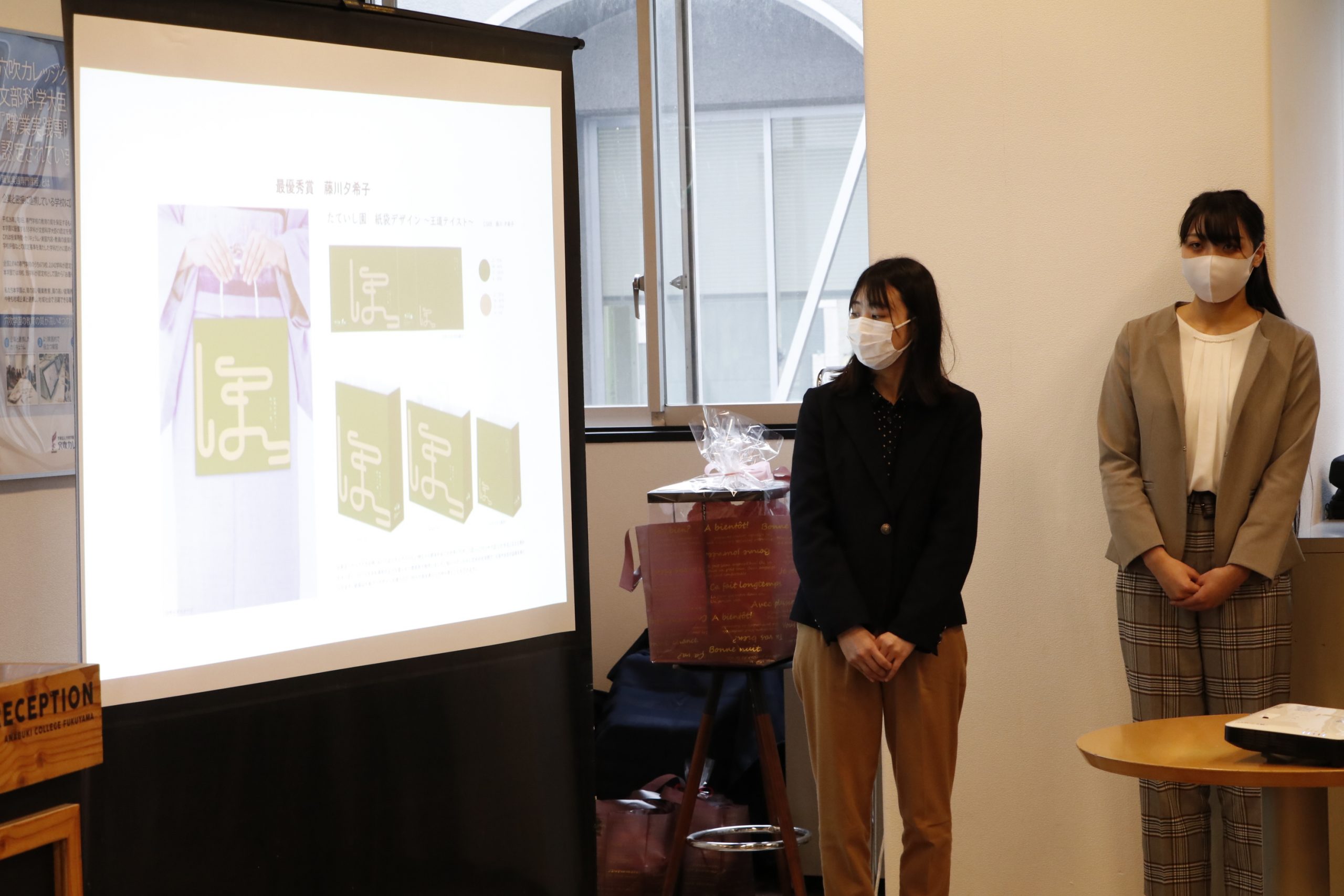 紙袋のデザインにはCGデザイン学科 2年の藤川 夕希子さんのデザインが最優秀賞に選ばれ、今後、紙袋として採用されることになりました。