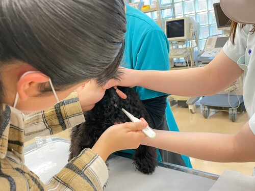 まずは動物看護師さんの体験から。動物病院で実際に行われている健康チェックを実践します。