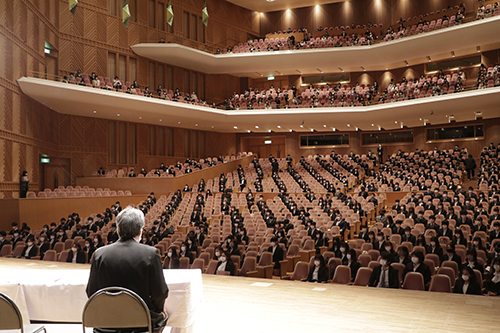 4月8日(木) 令和3年度入学式を行いました。例年、福山ニューキャッスルホテルを会場に行いますが、感染拡大予防の観点から今年度はふくやま芸術文化ホールリーデンローズを会場にし、座席の間隔をとって式を行いました。 プログラム自体も時短化され実施時間は30分程度でしたが、専門学校生活のスタートとなる節目の場ということもあり、新入生の表情も真剣かつ前向きなものに見えました。また保護者の方々も多く来場され、お子さまの晴れ舞台を一緒に楽しんでらっしゃいました。 明日(4/9)からはオリエンテーションや、授業がスタートする学科もあります。これから一緒に頑張っていきましょう!