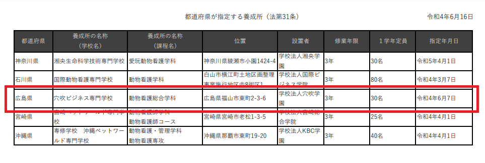 この度、2022年6月7日付けで、動物看護総合学科が「愛玩動物看護師法第31条第2号」に規定する愛玩動物看護師指定養成校として広島県より認可を受けました(いわゆる「既卒者」が対象の法附則第2条第1号養成所についても3月に認可済)。