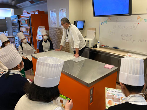 パティシエ・ベーカリー学科も、洋菓子・和菓子・製パンが学べる学科で今回は製パン体験。授業の製パン実習をお願いしているマルク・パージュオーナーの渡邉先生に担当してもらいました!(店休日が日曜日のため、毎年日曜日にお願い)