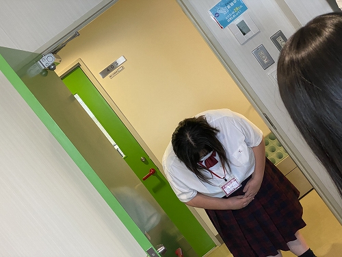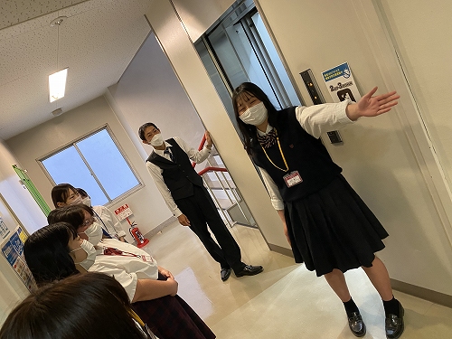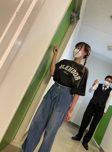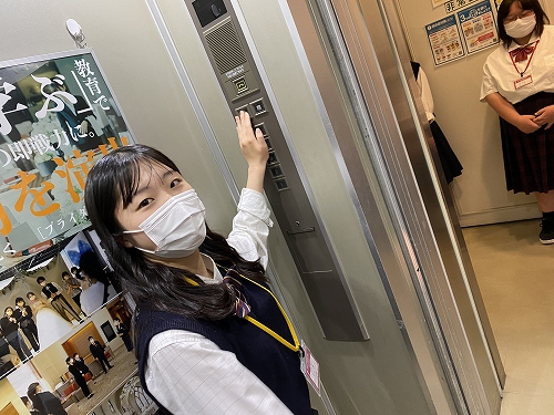 学校のエレベーターを使って、ベルマン(お客さまを客室までご案内する役割)所作を体験しました。