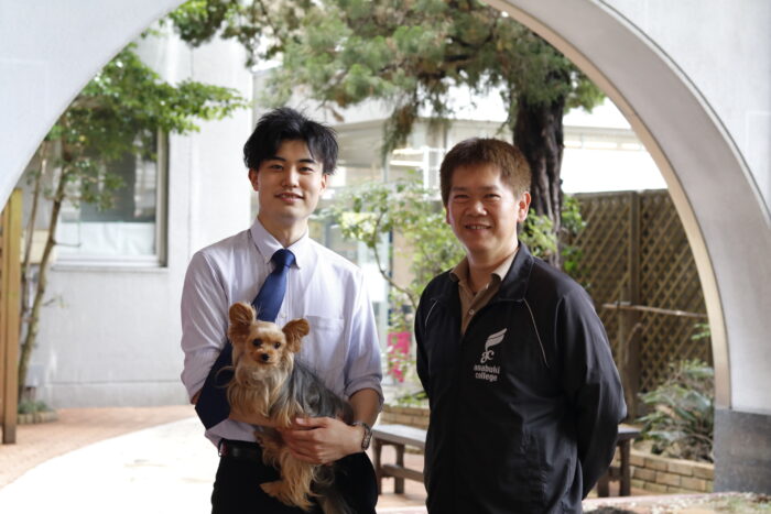 「毎日ててと一緒に登校して、一緒に卒業しました。休み時間に他のスタッフ犬と遊ばせたりするのも楽しかったですね。同級生もみんな動物好き、友だちとは就職後も仲良しです。」