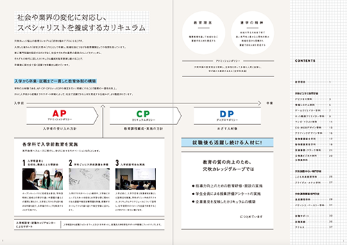 アドミッションポリシー(AP)ほか3つのPが一覧で掲載。学科ごとのカリキュラムももちろんわかります。