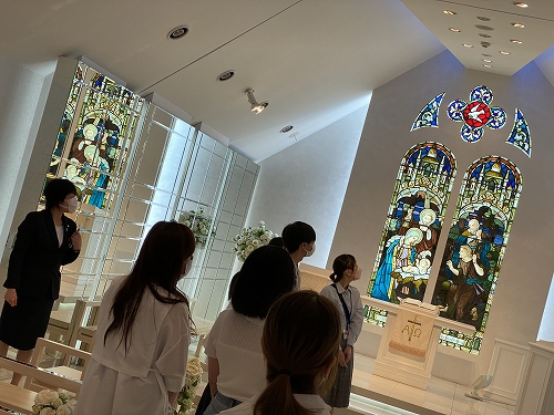 白を基調とした、落ち着いた雰囲気のチャペルでは、音響などの設備の説明や