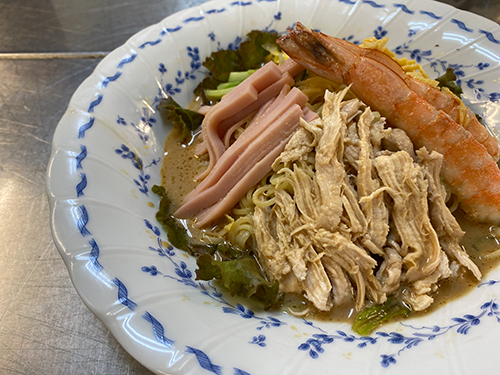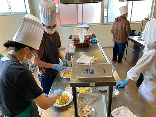 まずは高度調理学科。槌井先生の五目冷麺。家庭ではコストの面で入れないであろうエビが入っていたり、材料の切り方のコツなどテクニックを織り交ぜながらの体験授業になっています。