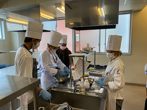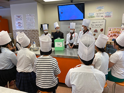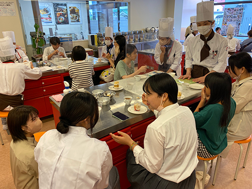 続いてパティシエ・ベーカリー学科の様子。今が旬の桃を使ったグラスデザートで、こちらも盛り上がりました!