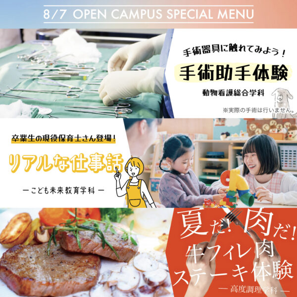 8月7日(日)は動物看護・保育・調理系の3分野でスペシャル企画を実施!