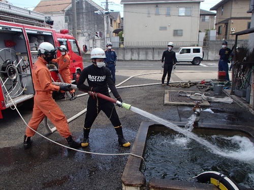 ポンプ車を使った消火訓練