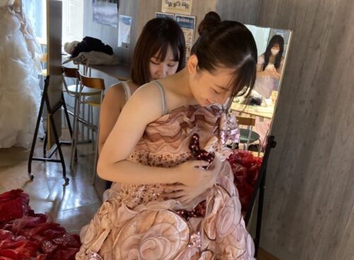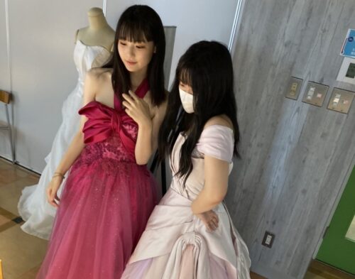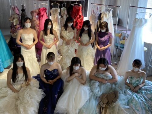 ペアになってもらって試着。背中のファスナーやホックを留めるのは一人では無理ですね。