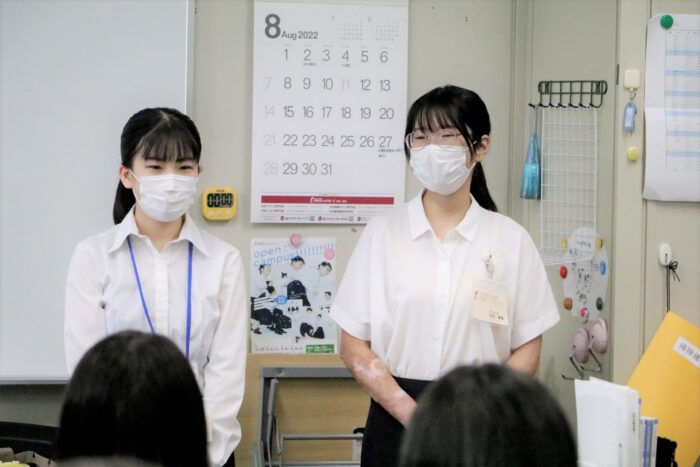 スーツ姿でアシスタントを務める細谷さん(大門高校卒)と竹本さん(福山誠之館高校卒)。
