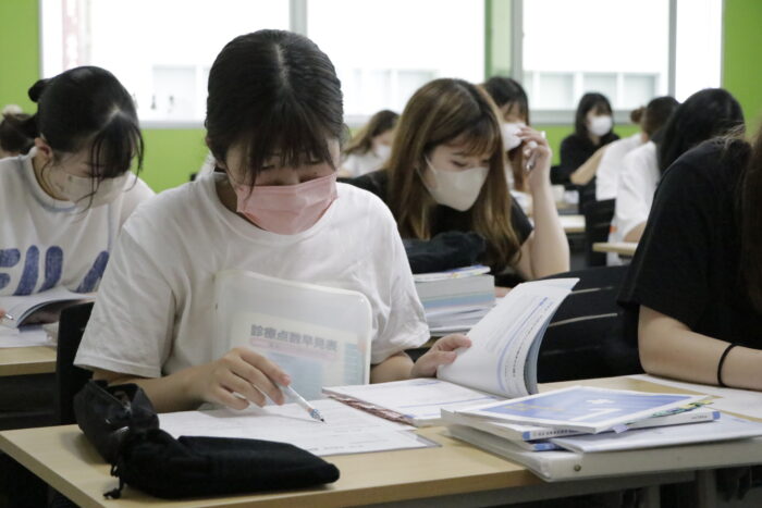 医療事務・クラーク学科では、「医療事務管理士」の試験本番を来週に控え、現在1年生の検定対策授業(補講)が行われています。