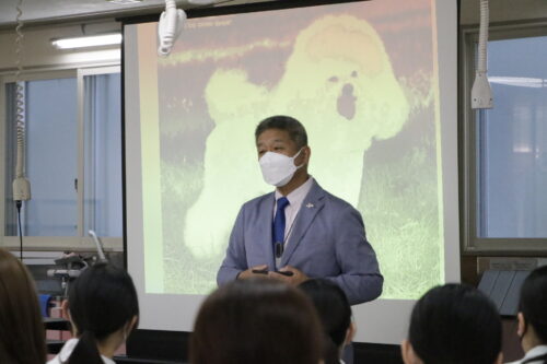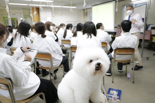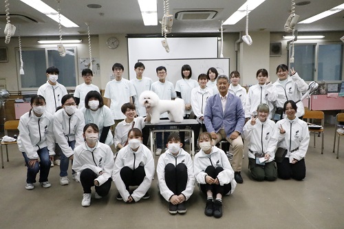 先生がトリマーやハンドラーになったきっかけや道のり、海外でのお話もあり、学生達は興味深そうに聞いていました。