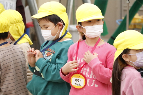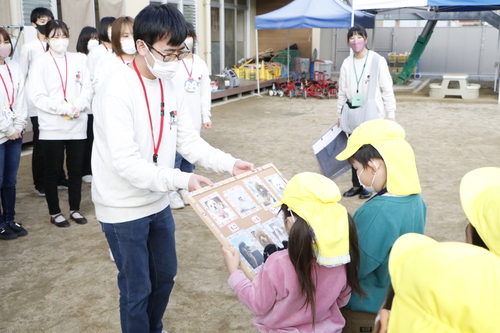 実は園児たちのお名前の手作り名札を作っていた学生。お名前をひとりひとり呼んで名札をプレゼント!