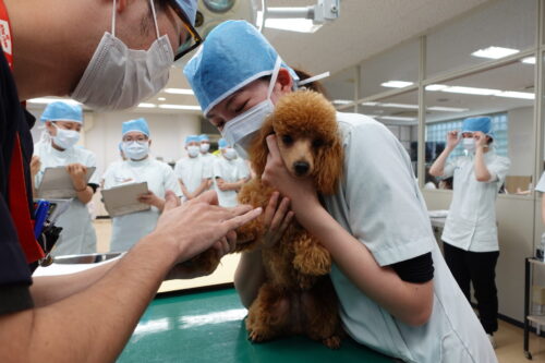 今日は動物看護総合学科の2年生が、スタッフ犬ポマくんと学生のわんちゃん絹くんの去勢手術を行いました。