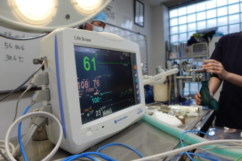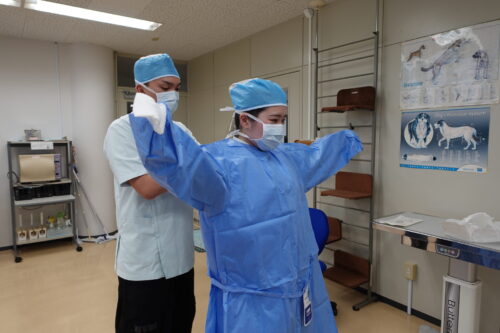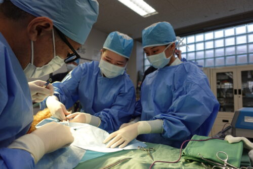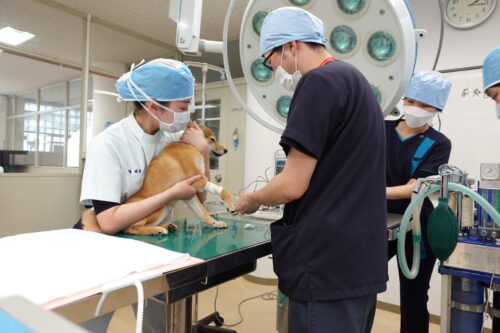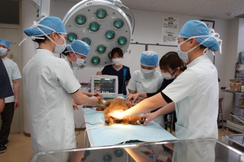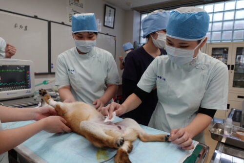 動物看護総合学科では年に数回校内で手術を行い、手術の準備・助手・経過観察など動物看護師として必要な技術を実践的に学びます。