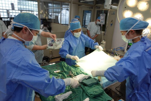初めての手術実習、全員が真剣に自分の役割をこなします