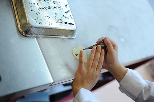 プレートに文字を書くパイピングも、山本先生がお手本を見せて