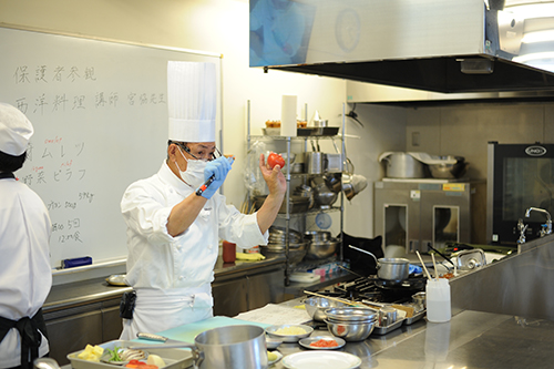仕上げに入れるトマトの湯剥きを説明する宮脇先生。