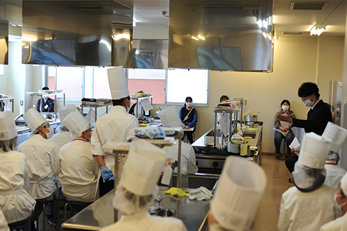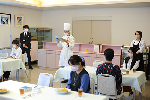 全て完成したら、レストラン実習室へ移動し担当学生から料理の説明を行ったのち喫食。