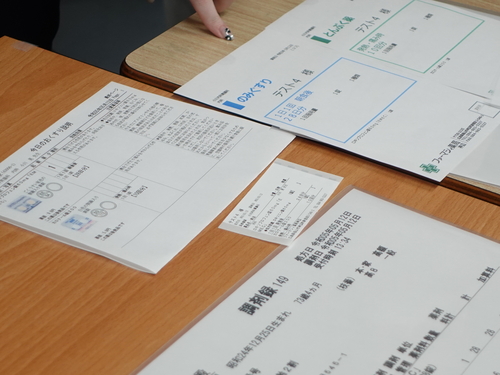 薬局で実際に使っている書類(サンプル)を使っての説明。企業見学でも通常見れない書類ということで学生たちも興味深々。