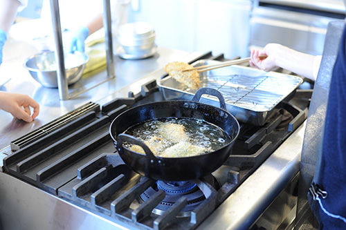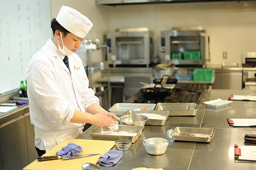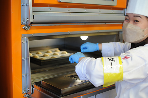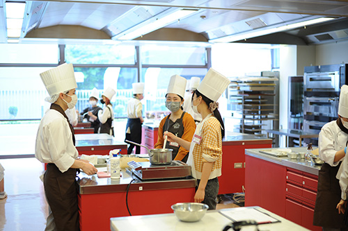 高度調理学科はハンバーグステーキ、パティシエ・ベーカリー学科は先輩たちと