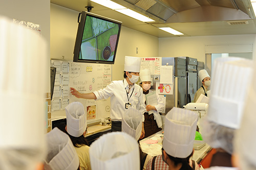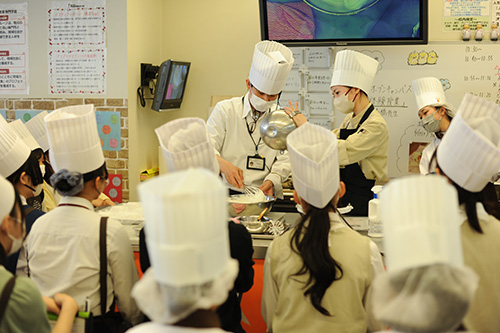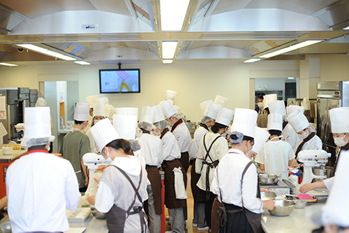 授業のほうはというと以前からハガキ等で告知しておりましたが、パティシエ・ベーカリー学科の体験授業はスペシャルメニュー。在校生の授業に入って、ホンモノを体験してみようという今回の企画。髙橋先生の説明からスタートして