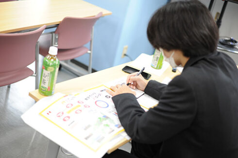 資料に載っていない情報は、しっかりをメモを取っていました。(机上のお茶は、ハローズ様から頂いたもの)