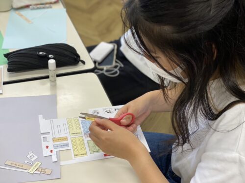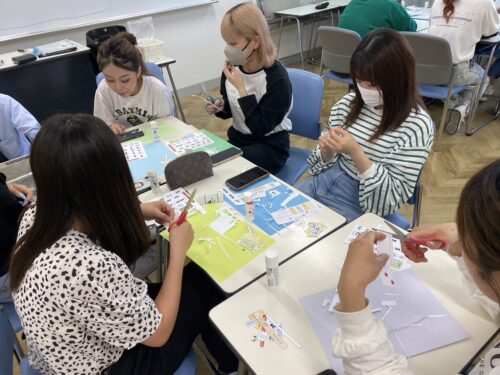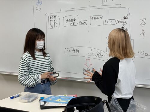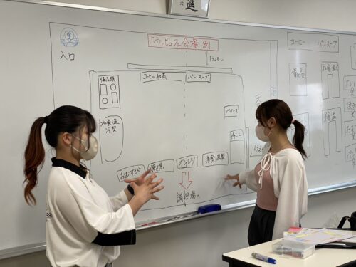 レイアウト考案の授業。ホテルの朝食会場をグループで考えました。