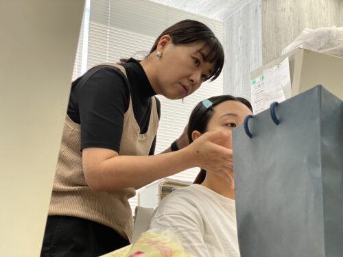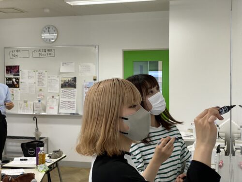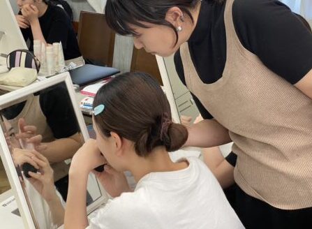 普段ベースやファンデーションを使っていない学生もいますが、メイクの先生に一から指導してもらいました♬