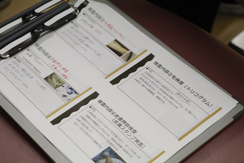 作ったサンプルを顕微鏡で観察。毛の形状から皮膚の状態を把握したり、寄生虫や細菌・真菌などを発見したりできます。