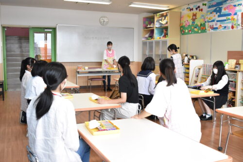 模擬保育として先生役と園児役にわかれて演習を行う授業を体験してもらうため、