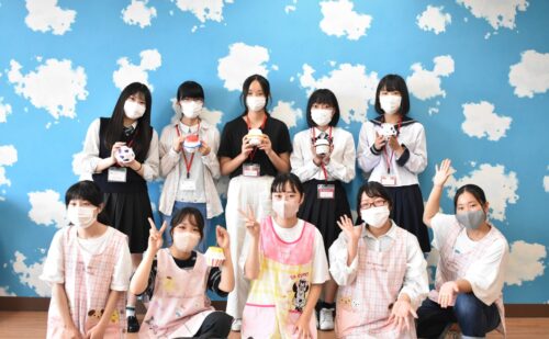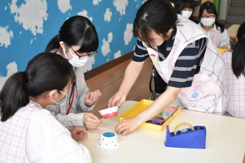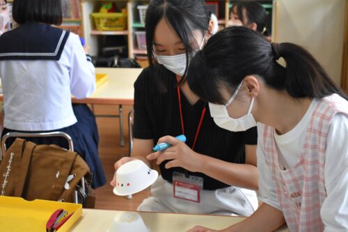 本日は学生スタッフが先生役、高校生のみなさんが園児役となって一緒にヨーヨーを制作しました。