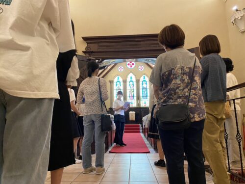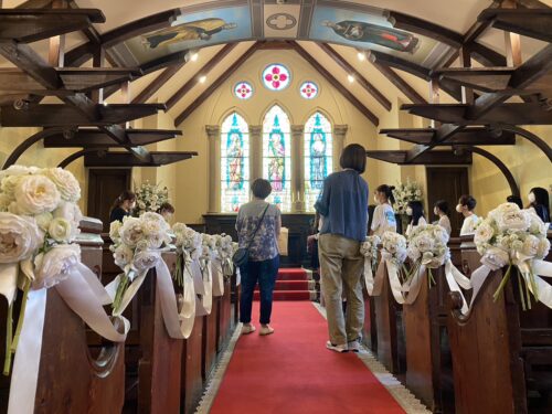 イタリアからとりよせたステンドグラスと椅子があり、とても落ち着いた雰囲気のチャペル。