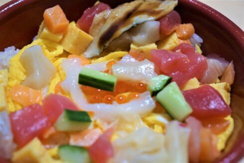 国家資格が卒業と同時に取得可能な高度調理学科では、東京の料亭で修行経験もある山本先生が作る「ばらちらし」。