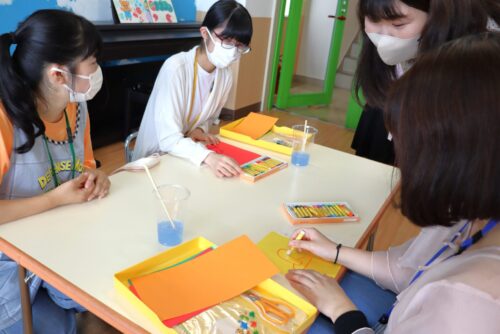 まずは卒業生の先輩方の指導のもと、学生スタッフと一緒に「スライムすいぞくかん」を作りました♪